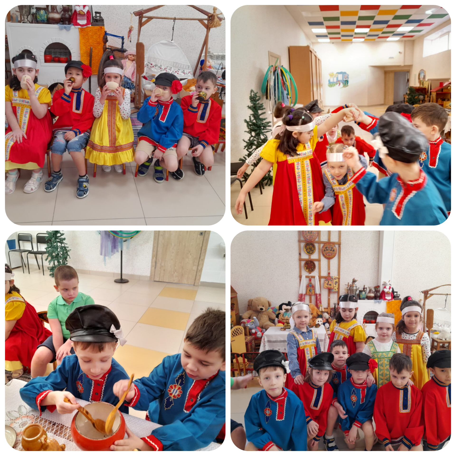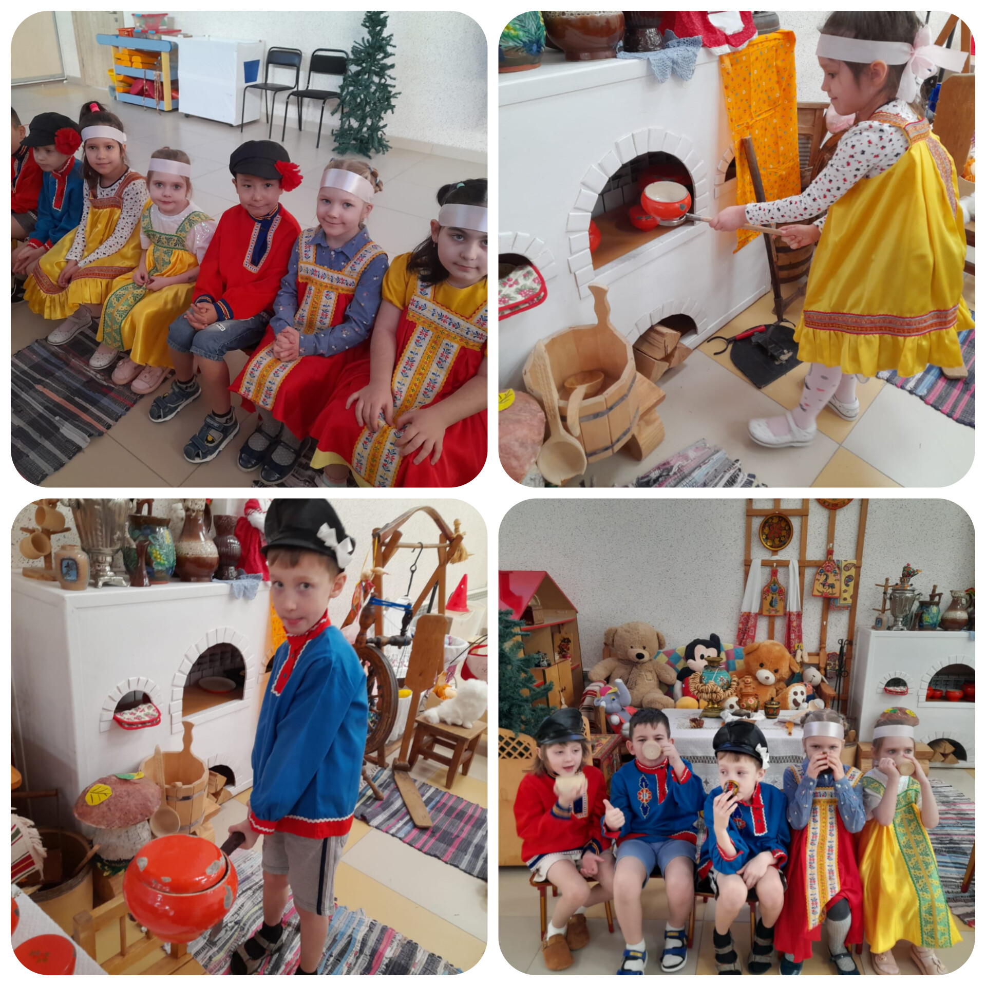 Дети в дошкольном отделении № 3 узнали много интересного и закрепили полученные ранее знания о том, как начиналось русское государство. Узнали об убранстве русской избы, об одежде русского народа, об их занятиях, о мужском ремесле и женском начале. Каждый ребёнок потрогал, поддержал в руках предметы старины - тяжёлые чугунки, ухваты, берёзовые поленья, деревянные ведра и ушаты. И, конечно, играли в народные игры: "Ручеёк", "Золотые ворота", "Гори, гори ясно", "Как у дяди Трифона". Поговорили о традициях русского народа, как принято встречать и угощать гостей. Интересно было узнать, для чего предназначалась русская печь. Всем детям понравилось занятие, все окунулись в быт старины.