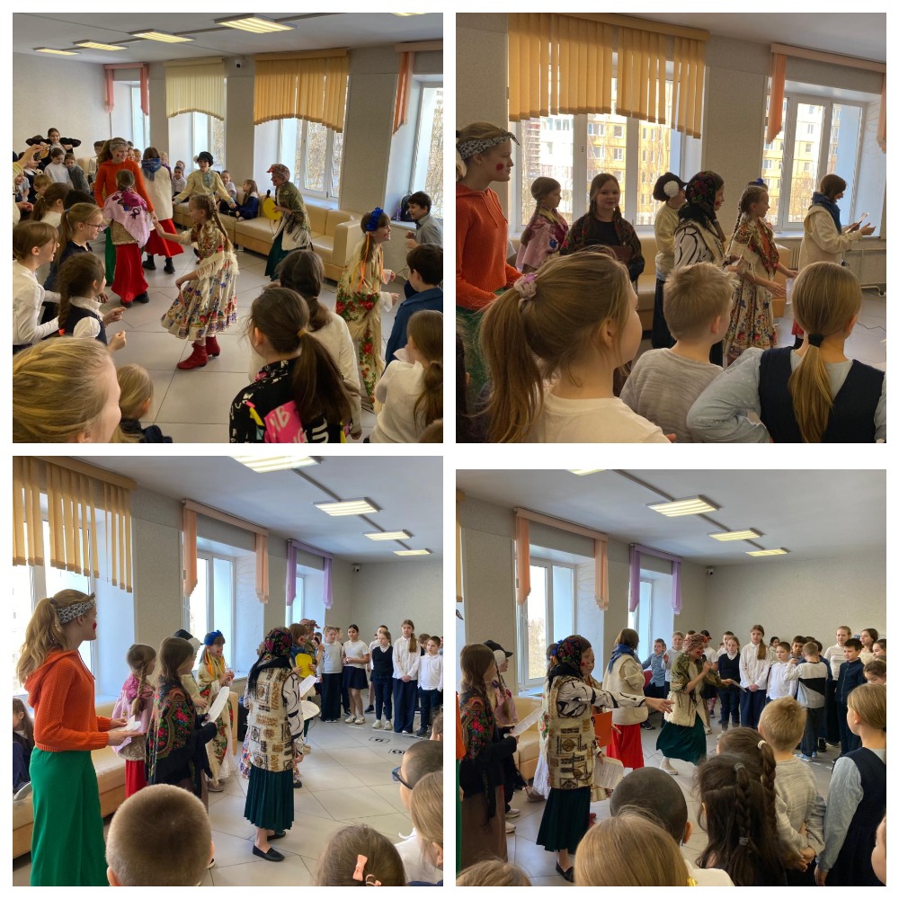 Вместе с актерами театральной студии «Зазеркалье» ребята начальной школы узнали, как называются дни масленичной недели, какие существуют традиции. Веселый танец «Ручеек» подарил всем заводное настроение, а ещё участники успели побыть веселыми «воробушками», которые спасаются от «ворон», ну и конечно, не обошлось без «блинов», роль которых исполняли мальчики в веселой весенней закличке.