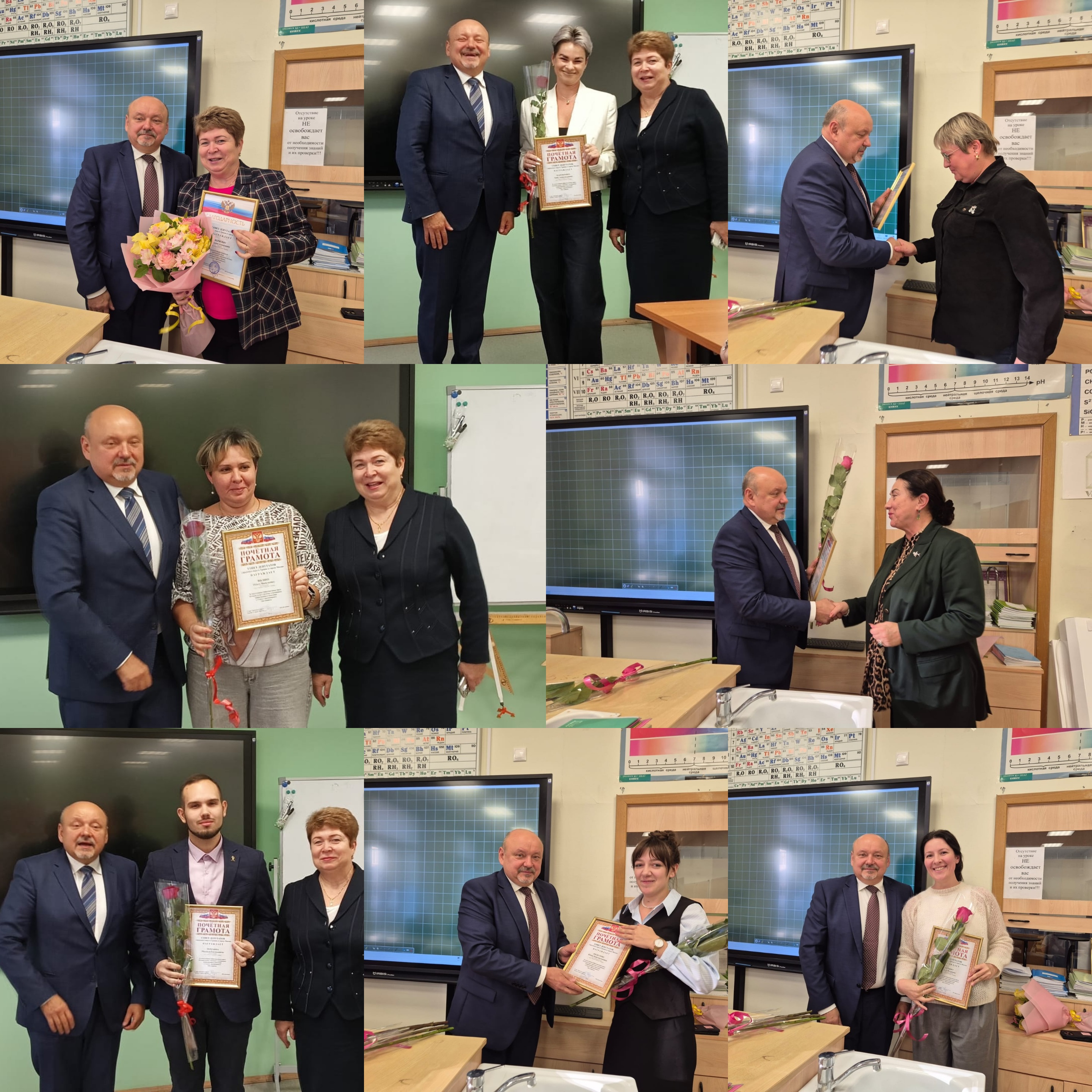 Глава городского округа Троицк в городе Москве Владимир Евгеньевич Дудочкин посетил производственные совещания коллектива Гимназии, чтобы лично поздравить учителей, вручить заслуженные награды и поблагодарить за неустанный труд, мудрость и терпение. От имени Совета депутатов города были вручены Благодарности лучшим педагогам — знак признания их важной миссии и ежедневного вклада в воспитание подрастающего поколения.